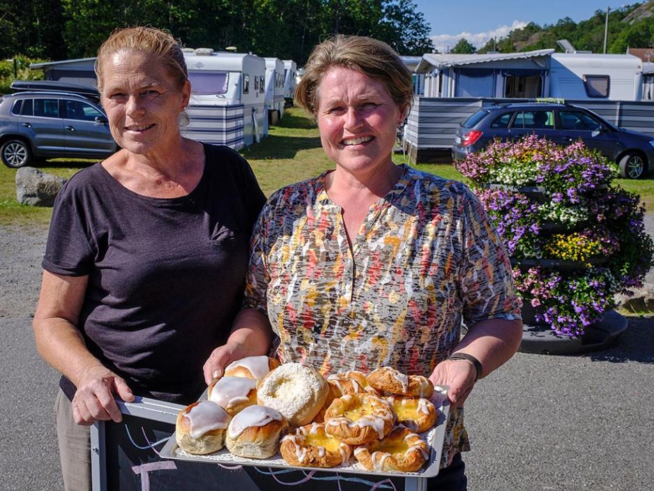 – Halv sju hver morgen begynner vi å steke bakervarene. Boller og rundstykker er mest populært, men vi byr også på wienerbrød, skoleboller, hvetestang, croissanter og forskjellig brød. Vårt lille landhandleri byr også på kortreiste bær, alt etter sesong, forteller Ine, og legger inn ekstra reklame for campingplassens ferske boller.