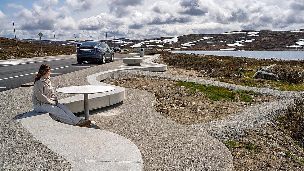 - Betongkragen er rettlinja og stram inn mot veganlegget, og buktar seg i ei organisk mjuk linje ut mot det naturlege landskapet og skaper varierte og unike små tilhaldsstader, seier han.