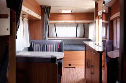 Dinetten midt i mot kjøkkenavdelingen har som sagt plass til fire personer. Sittekomforten er noenlunde med faste sitteputer, men ryggputene savner korsryggstøtte. Generelt er alle puter og madrasser ganske harde. Bra for undertegnede med dårlig rygg og dobbeltsengen kan selvsagt kompletteres med en litt mykere overmadrass, som også skulle forenkle oppredningen. Det er ingen problem for en fullvoksen, og ikke alt for lang person, å få plass i køyesengene bak sittegruppen. Det føles mer koselig enn trangt i disse, men vi hadde ønsket at leselampene og vinduene hadde vært plassert i samme ende av sengene. Den er mulig å slå opp den nedre sengen og under denne er det et stort lasterom. Imidlertid finnes det ingen utvendig lasteluke som det gjør under dobbeltsengen. Det er lett å slå opp begge disse sengene, men de står ikke i oppslått stilling. Inntil køyesengene finns baderomsdøren som er smal, men vel inne på toalettet er det bra med albuerom. Thetfords vridbare toalettstol er plassert slik at man i prinsippet må vri den ut for å få plass. Da havner imidlertid føttene ovenfor det dypere dusjkaret, noe som gjør at jeg ikke når ned med helene.