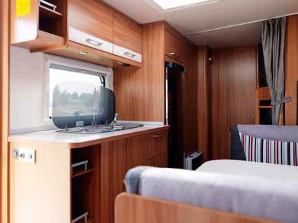 Men la oss nå fortsette forbi dobbeltsengen foran. Til venstre finnes kjøkkenet med en kombinert tre bluss komfyr og oppvaskkum fra Dometic. Arbeidshøyden er hele 94 cm, noe som gjør det litt vanskelig for kortvokste å jobbe i oppvaskkummen, som er plassert drøye 20 cm inn fra kanten. Avlastningsplassen er ok, i likhet med plassen i skapene ovenfor benken. I underkant finns romslige oppbevaringskap, med plass til det nødvendige og litt til. Bare en skuff for bestikk er litt dårlig, spesielt siden det finns plass for en til som skulle kunne ha plass til øvrig kjøkkenredskap. Nærheten til det store kjøleskapet er et pluss, og ovenfor det finns plass til en liten mikrobølgeovn om man vil. Kjøkkenvifte mangler, men det finns et vindu for utlufting av stekeos. Strømuttaket er plassert ovenfor oppvaskkummen, noe som ikke er så smart. I andre enden av kjøkkenbenken finns nemlig en bra plass for kaffetrakteren. På nye, dyrere, campingvogner har vi også blitt bortskjemte med de store oppbevaringsboksene, som er lette å håndtere og oversiktlige. Her er det tradisjonelle luker og hyller som gjelder, noe som gjør at man må krype ned på gulvet for å komme til lengst inn. I det hele tatt føles det som om nyere løsninger og teknikk kombineres med litt gamle varianter i denne vognen. Her finns for eksempel halogenlamper i taket, til erstatning for den forrige årsmodellens plafond, kombinert med flere LED-lamper med smart touchkontroll.
