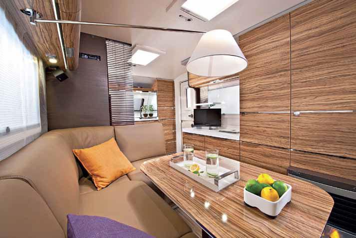 Møblene er veldig avrundet og designet i treimmitasjon. I trevirket skjuler det seg mange oppbevaringsmuligheter. Det er det glamorøse som skal framheves i denne modellen. Du får blant annet Adrias nye kjøkkenkonsept – med intelligent bruk av plassen: Komfyr med tre kokeplater og vask med tilpasningsbar arbeidsplass. Kjøkkenbenken har en smart kombinasjonsløsning for både vask og arbeidsområde, mens resten av kjøkkenet også har et meget eksklusivt utstyr. Sittegruppen har en glamorøs stil på møblene, og her er det også integrert en pop-up TV-holder. Vogna har Adrias ERGO baderomsløsning, som gir deg god plass og et moderne design. Med elegang LED-lys og mange flotte løsninger er dette badet en helt spesiell opplevelse.
