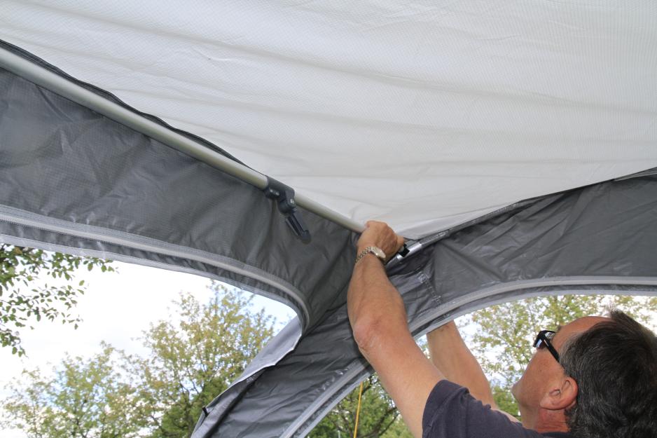 Sammen reiser vi til nabo Perry Caravan for å hente en Fendt kjørevogn, og så finner vi oss en gressplen hvor vi kjører inntil. – Du trenger ikke parkere vogna på gress selv om forteltet bør settes opp på mykt underlag, og det er heller ikke noe problem at det er høydeforskjell på vogna og teltet - slik som her, forteller Andersen. Han argumenterer med at teleskopstengene uansett vil kunne tilpasses, og viser i demonstrasjonen at det stemmer bra.