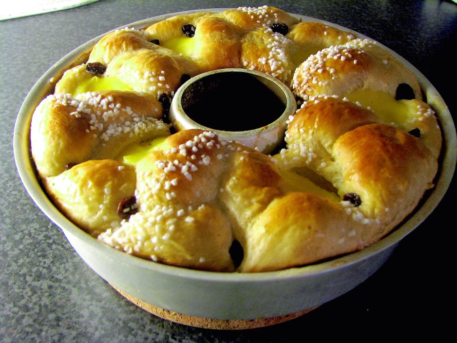 Vaniljekrem: 1 dl melk 2 ½ ss vaniljekrempulver Smuldre gjæren i en bolle. Smelt smøret i en kjele på komfyren. Rør ned melken. Hell blandingen i bollen og rør til gjæren er oppløst. Vei/mål opp resterende ingredienser (spar noen rosiner til pynt) og tilsett disse. Elt deigen til den er glatt og blank. Deigen er klar når du kan trekke den ut uten at den går i stykker. La deigen heve tildekket med en bakehåndduk i ca. 1 time. Form deigen ut fra egen fantasi eller som følger: Del deigen i tre like deler og rull dem i 50-60 cm lange lengder. Flett sammen lengdene. Det er viktig at fletten blir omtrent like tykk hele veien, hvis ikke kan den bli ujevnt stekt. Smør og strø formen og legg i fletten. La den heve i ca. 40 minutter på et lunt og varmt sted. Pensle den ferdiggjærede fletten med pisket egg. Dekorer med rosiner og vaniljekrem samt perlesukker hvis det ønskes. Stek på gassplate i ca. 35-40 min. på svak varme. Hvetekransen er ferdig når den har en fin farge og en temperatur på 96 grader.