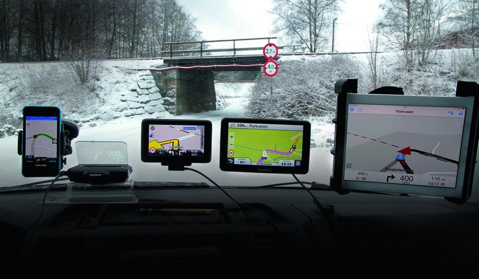 Din Fritid har samlet totalt fem GPS-enheter som er montert i frontruta på bilen vår. Vi har tatt utgangspunkt i at disse skal benyttes til bobilbruk eller bil med campingvogn. Da er det viktig å unngå lave underganger, u-svinger og smale grusveier. Det er svært få modeller på markedet som tar hensyn til type kjøretøy når den gjør utregninger. Flere av boksene kan enten ha et bobilikon eller du kan velge det som kjøretøytype, uten at du kan plotte inn informasjon om høyde, lengde og bredde. Det er kun TomTom 1005 og Garmin 760 som lar deg plotte inn denne infoen. Av disse to er brukervennligheten best på TomTom. Her velger du enkelt om det er bil, bil med campingvogn eller en bobil du kjører med. Deretter kan du gå inn i undermenyen for å velge lengde, høyde, bredde, akselvekt og maks tillatt hastighet på din bobil. På Garmin kan du lage deg flere profiler, og gi de logiske navn. Her kan du velge de samme kriteriene som TomTom, men ikke akselvekt og makshastighet. Det er ikke Garmins største problem: For Garmin 760 tok ikke hensyn til de dataene vi la inn på kjøretøyet, eller så har den for unøyktige kart.