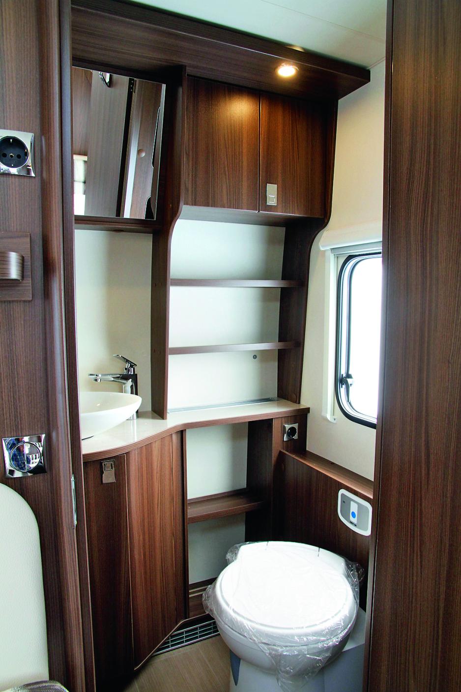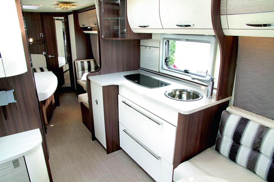 Vi har også sjekket taket, som er uten skjøter og ser ut til å ha gode muligheter for å unngå vann-ansamlinger. Like fornøyd er vi ikke når vi kikker under vognen og ser at det er en del ledninger som går på undersiden av vognen - uten beskyttelse. Hvordan disse vil se ut etter en del års bruk med steinsprut og fysisk tøft miljø er vi spent på. Bürstner har brukt korteste vei for å trekke vannledningene fra bad til kjøkken, noe som vil si under gulvet. Rørene er isolerte, om de også har elvarme klarte vi ikke å bringe på det rene før vi gikk i trykken. Andre produsenter har valgt å konsekvent trekke vannet innvendig. En bedre, men også dyrere løsning som man finner på premium-modeller.