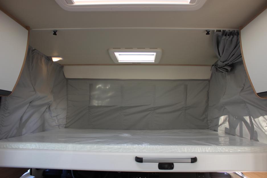 Soveværelse bak i bilen er romslig, lyst og sengen virker tilsynelatende komfortabel. En 12 cm tykk madrass ligger på fjærende treribber og den måler 180 x 148 cm. Ved å trekke madrassen litt frem kan en 15 cm bred tilleggsmadrass legges til ved hodeenden slik at sengelengden blir 195 cm. Da blir det til gjengjeld trangt å passere ved fotenden på toalettromsiden. På den andre siden er dusjen åpen når den ikke er i bruk, så det er lettere å passere. Ellers er sengen relativt lav, det er 77 cm fra gulv til madrass. Dette medfører at garasjen under ikke har tilstrekkelig høyde for vanlige sykler (h:98 cm), og at det derfor er montert sykkelstativ på bakveggen.