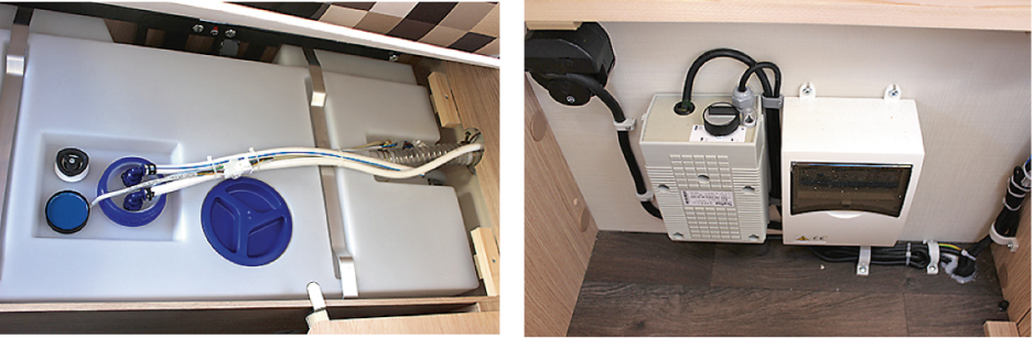 I sidesitteren er sikringer for sterkstrøm og styring av den elektriske gulvvarmen plassert. For øvrig er det god plass til skotøy og liknende med tilgang fra liten luke ved inngangsdøren. I baksetet er vanntanken plassert. Her sitter man som vanlig noe oppreist, mer korsryggstøtte under lange etapper hadde vært av det gode, men sofaputer kan gjøre nytten. Ellers bra seter, nakkestøttene i baksetet kan justeres i høyden. Under førersete er elblokka fra Schaudt plassert og under passasjersete finner vi bodelsbatteriet på 95 Ah.