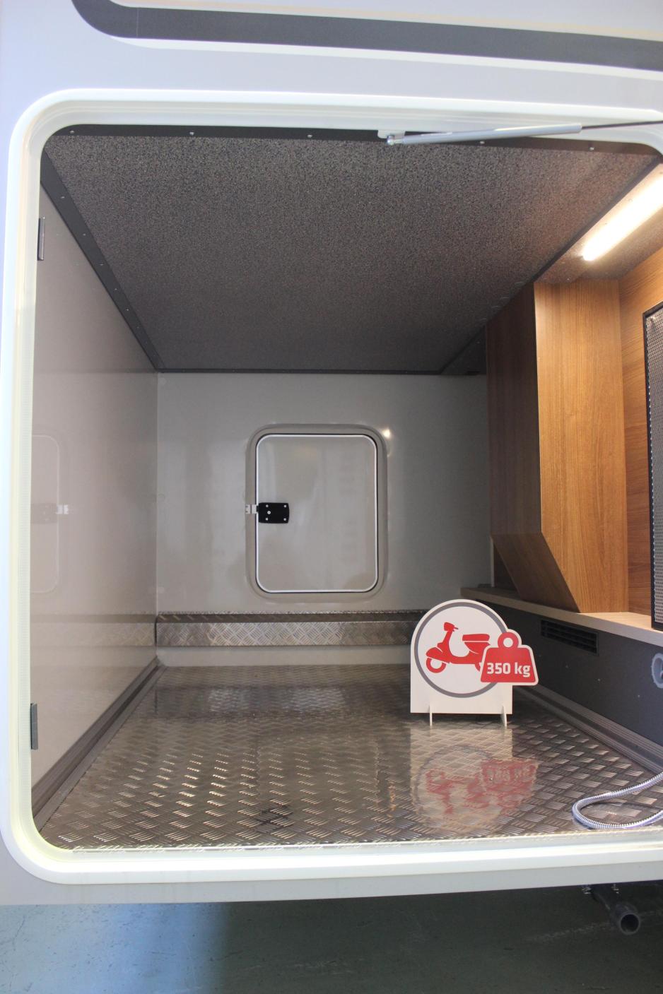 Garasjen imponerer med bredde på 130 cm. Lengden er 205 cm, som skyldes en smalere bil, men rommet er etter vår mening mer enn stort nok. Det er i tillegg beregnet for tyngde opp til 350 kg. Her må man selvfølgelig tenke på at totalvekten ikke overskrides. Høyden i garasjen er 119 cm, og luken på høyre side måler 105 x h 113 cm. Det er også en mindre luke på motsatt side som måler 50 x h 65 cm. På hver side i garasjen er det skinner for stroppefeste.