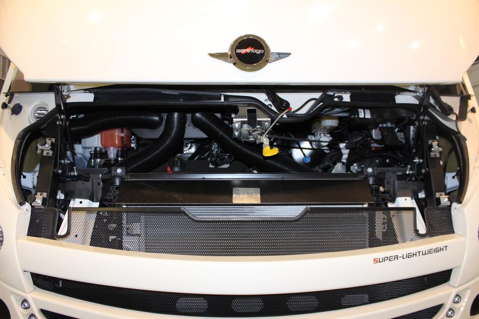Tilgangen til motoren er grei. Dekselet heises opp, og du må bøye deg ned for å se inn. En luftslange for inntak av friskluft ligger rett over oljepeilepinnen og oljepåfyllingen. Den bør legges mer til siden. Også den utvendige påfyllingen av spylervæske ligger med minimalt fall slik at påfylling vil ta noe tid.