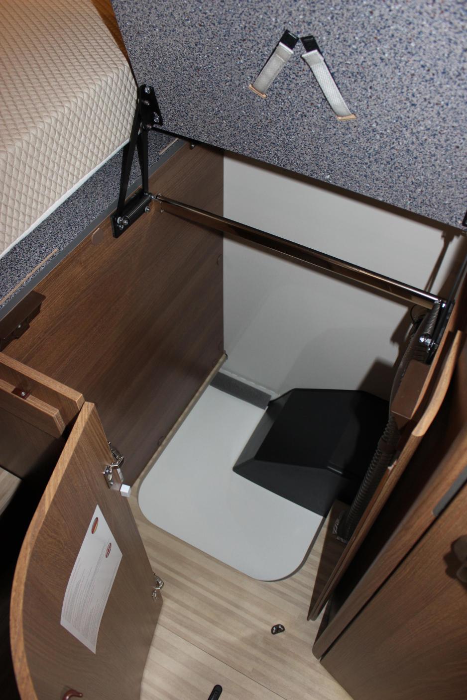 Hengeskapet finner vi under fotenden av sengen, på venstre side bak. Madrassen over er delt og kan lett vippes opp. I tillegg er det dør på siden. Skapet måler 60 x 75 x h 105 cm, mens et tilsvarende skap med hylle på motsatt side måler 50 x 75 cm.