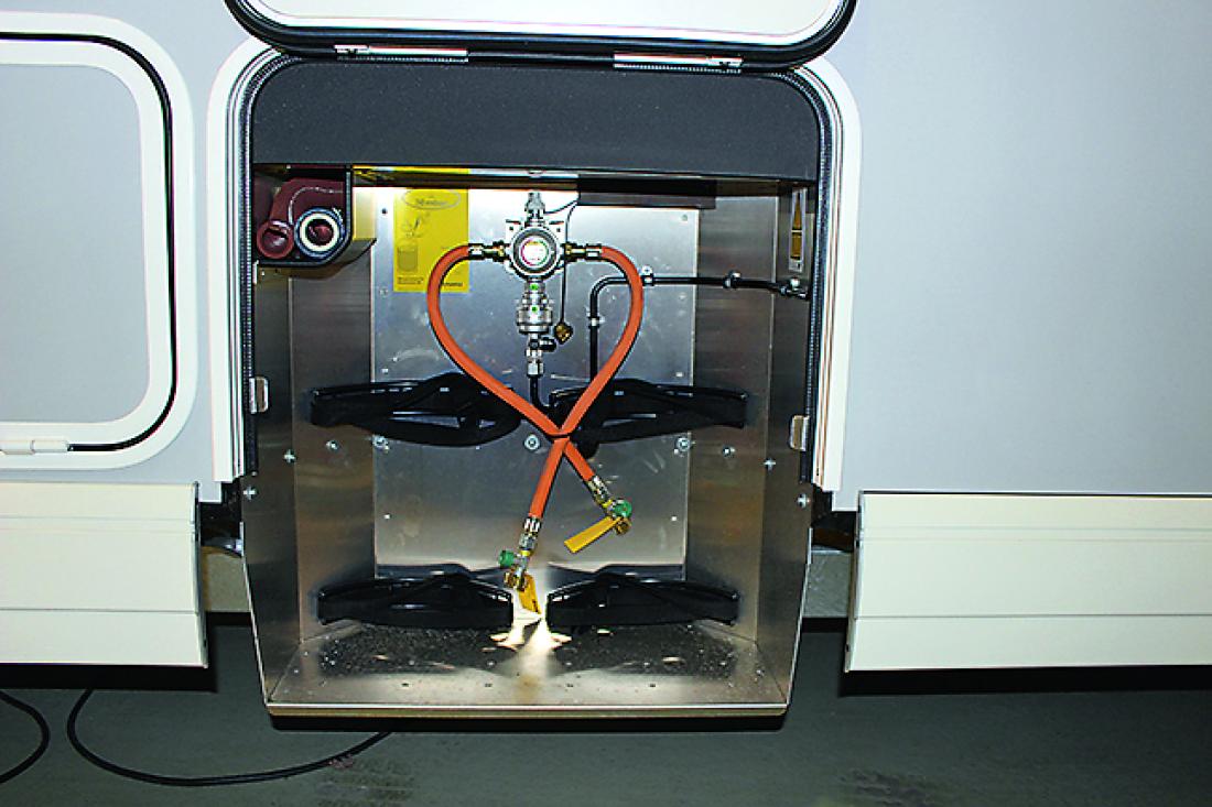 Om bilen hadde hatt doble vinduer i førerhuset ville den være en super vinterbil, men her kommer dette med vekt inn i bildet… Slike vinduer kan fås som tilleggsutstyr, i en «polarpakke» som øker vekten med 42 kg. I denne pakken følger det også med isolermatte for frontvindu og fotrom i førerhuset, pluss et ekstra varmeapparat som går på motorvarmen. Vist bil hadde Truma kombivarmer på seks kilowatt med elektrisk tilleggsvarme. Varmen slippes ut rundt om i det doble gulvet, i flere ventiler langs gulvet og i fronten under frontvinduet. Begge tankene ligger i det oppvarmede doble gulvet. Kranen til spillvannstanken ligger tilgjengelig under en luke i gulvet, rett innenfor inngangsdøren. Avløpet for spillvannet ender ved høyre hjørne bak, der en forlengelsesslange kan settes på.