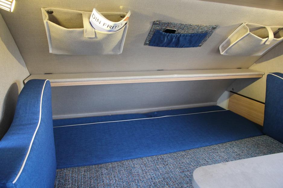 Interiøret i testvognen er lyst og trivelig: Vegger og tak i en off-white farge med klassisk trefargede skapdører og kjøleskap. Putene i sofaen gir en frisk kontrast med sine blånyanser og blir alibiet som understreker at dette er en moderne vogn.