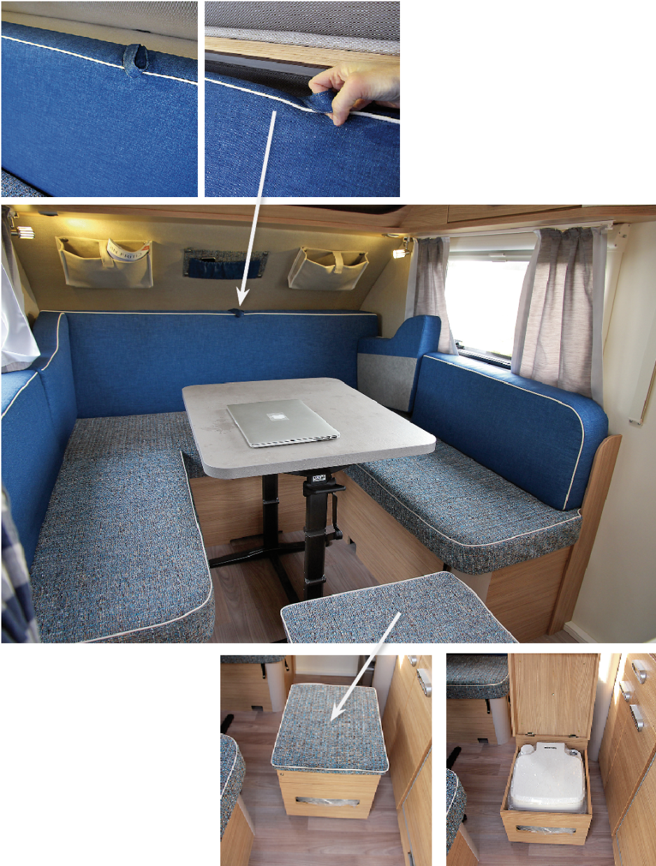 Det er ikke toalett på denne modellen, som jo i praksis består av kun ett rom. Til gjengjeld følger det med en kompakt Porta-potti mobil toalettløsning, forkledd som en puff. Denne kan brukes som skammel eller sitteplass, og så er det mulig å trekke for alle vinduer og jage ut reisefølget, før man gjør det man må gjøre. Alle vinduer har blending, inkludert de to runde vinduene. De tre andre vinduene og takluken - som alle kan åpnes - har i tillegg myggnetting.