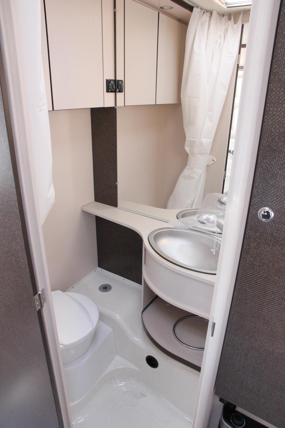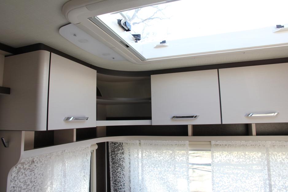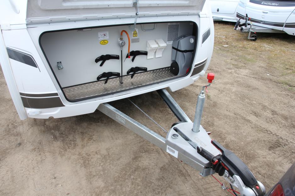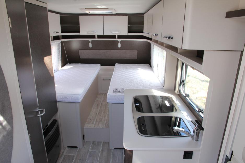 En løsning denne modellen skiller seg spesielt positivt ut er løsningen rundt sengene og lagerplassen under disse. Sengene er forholdsvis høye, uten at det er påfallende. Gangen mellom disse består av en kasse for å få riktig høyde når du skal opp i sengen. Og under dette området er det lagringsplass i hele vognens bredde. Legg til at begge sengene kan vippes opp for lett adkomst, og ikke minst: En stor utvendig luke som gir deg tilgang til hele området. En veldig god løsning!