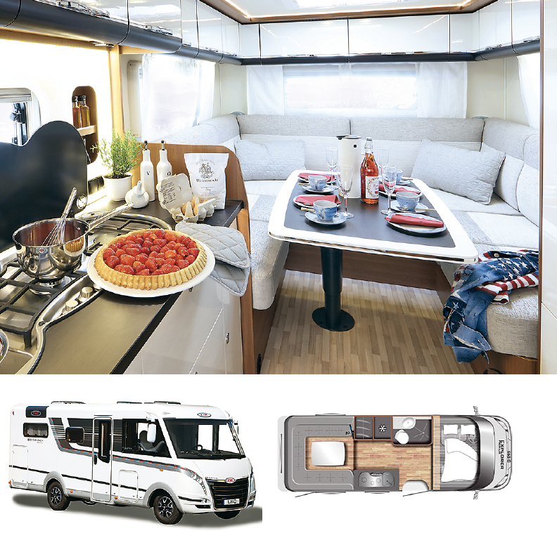 LMC har kastet seg på sofatrenden med sin 2018-utgave av Explorer Premium. Hele bakerste delen av bobilen er fylt med en romslig rundsitter, og det er kort vei til kjøkkenet. LMC har i tillegg gjort et smart grep for å få mer høyde i garasjen. Den bakerste sofaen kan heves når den ikke er i bruk. Det er også et skap, og løsningen har ført til at badet har kommet langt fram. Det har gått på bekostning av miljøet foran, hvor de to vendbare stolene står litt for seg selv. LMCs 12 års tetthetsgaranti er markedets beste.