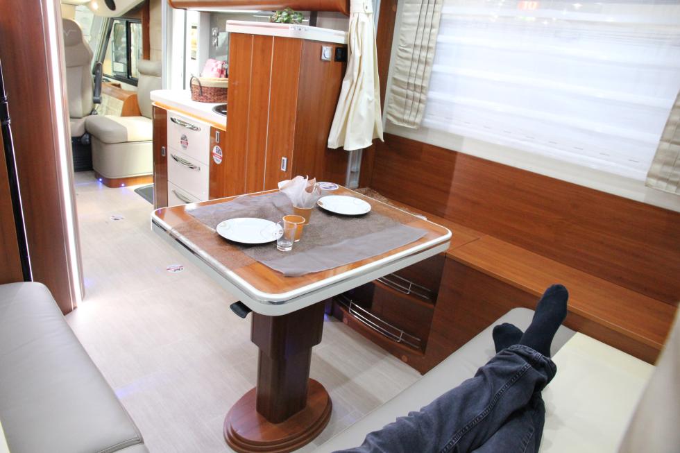 Modellen har vinkelsofa, ikke rundsitter. Fiks detalj med sammenleggbart salongbord som kan plasseres i en skuffehylle under salongen. Integrert skammel, med oppbevaringsplass, for grei adkomst til bakre senkeseng. Panoramavinduer på tre sider. Skyvedør for å kunne skille av det bakre rommet.