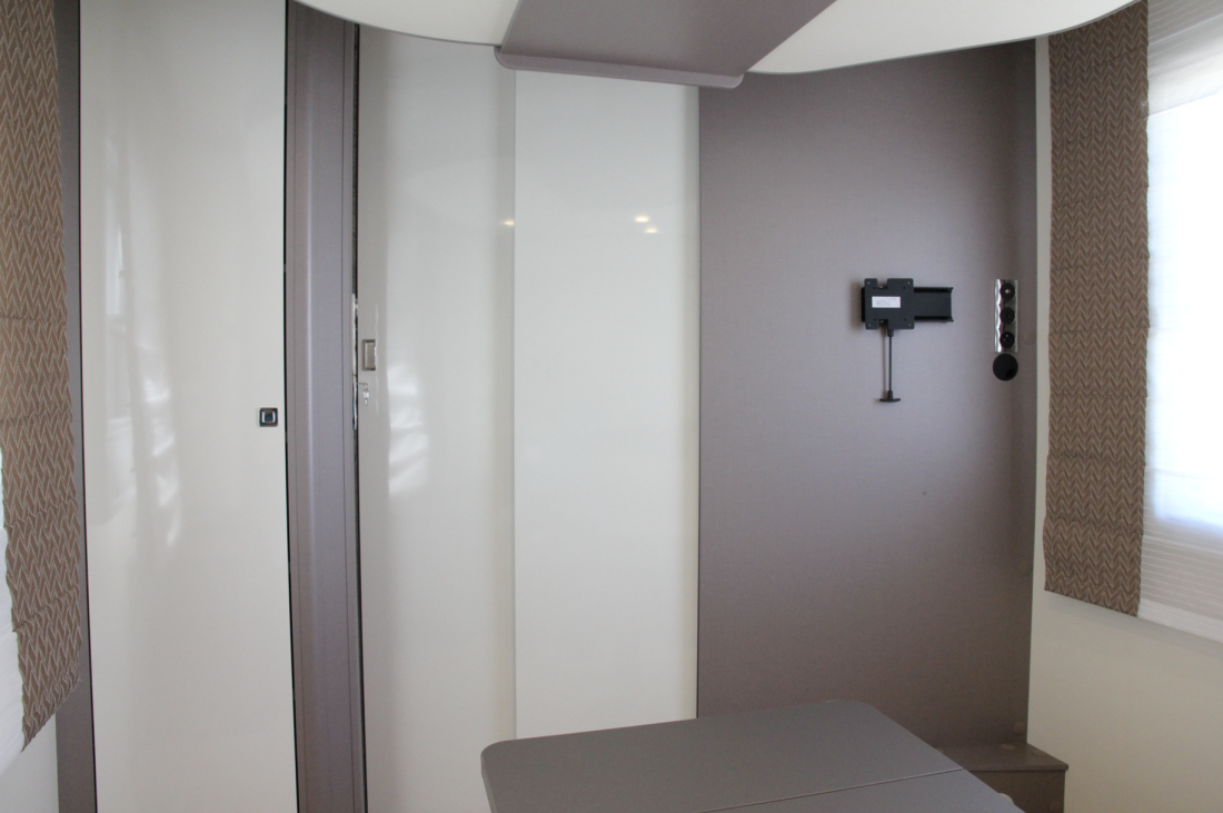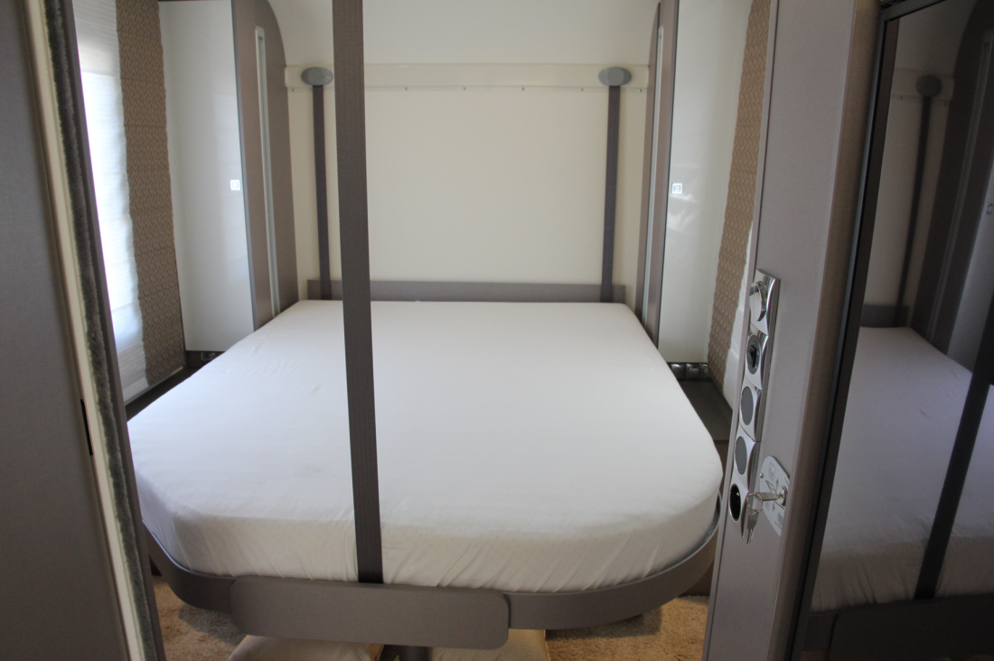 Sengeløsningen er tradisjonell med en tverrstilt dobbeltseng, og badet er av den kompakte typen som har alt på meget liten plass. For å gjøre dette rommet funksjonelt kan vasken felles opp, inn mot veggen. Madrassen i sengen er delt, så det er enkelt å felle opp deler av denne også. Det gir mulighet for å ta med bord og stoler, eller sykler.