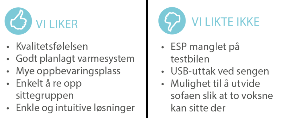 Den har mer oppbevaringsrom enn mange andre bybobiler, noe som gjør det enklere å holde ”ordning och reda” ombord. Varmesystemet er gjennomtenkt, og fungerer godt. Å re opp en ekstra seng er fort gjort – og den er til og med ganske behagelig.