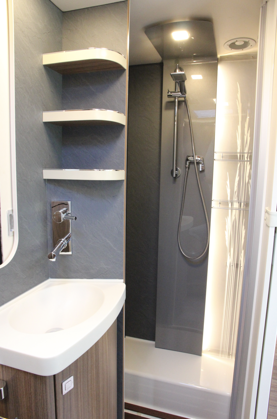 Badet er romslig, og går fra vegg til vegg. Dusjen har samme strå-dekorelementer som sine lengre storesøsken. Platen som dusjhodet er festet på ser ut som et dekorelement, men er også en liten ovn, varmet opp av bobilens vannbårne varme fra Alde.