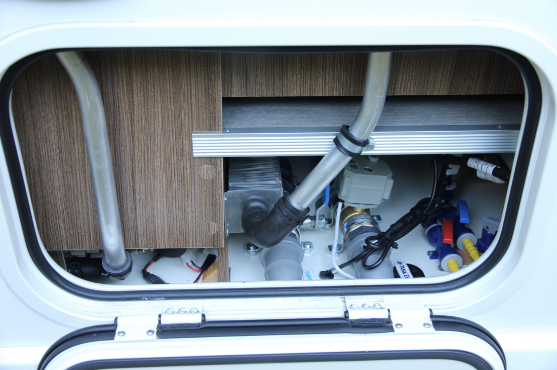 Det er mye utstyr og tilbehør på denne modellen, og uten instrukser bruker jeg noe tid på å finne ut av hvordan rutinene for den helelektriske tømmingen av gråvannstanken fungerer. Først slår du på en bryter for kameraet som er plassert ved utløpet, deretter velger du dette kameraet på multimediaskjermen. Det er lett å se på skjermen når du er korrekt plassert, og da er det bare å trykke på en annen bryter - så vil den elektriske kranen åpne seg, og du kan tømme gråvannstanken uten å behøve å flytte deg fra førersetet. Eura Mobils Integra-serie er beregnet for vinterbruk, og produsenten er en av de flinkeste i klassen til å utnytte Aldes vannbårne varme. Det er nemlig en jobb for viderekomne, om en tar i betraktning at det må være implementert så mange meter med konvektor som mulig, og god gjennomlufting rundt disse.