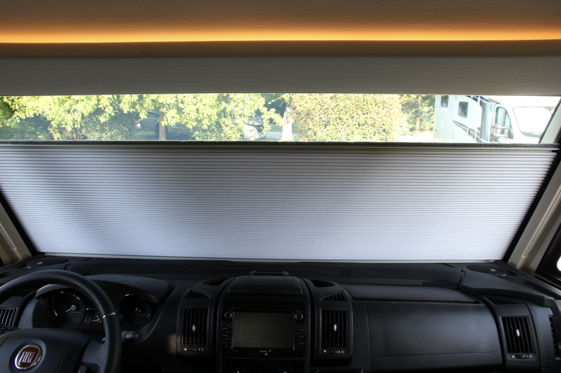 Vi befinner oss ved Atlanterhavskysten i Frankrike i juli. Det er varmt, og fokuset er mer på aircondition enn at den integrerte bobilen har avansert utstyr som innebygde varmetråder i den store frontruta.