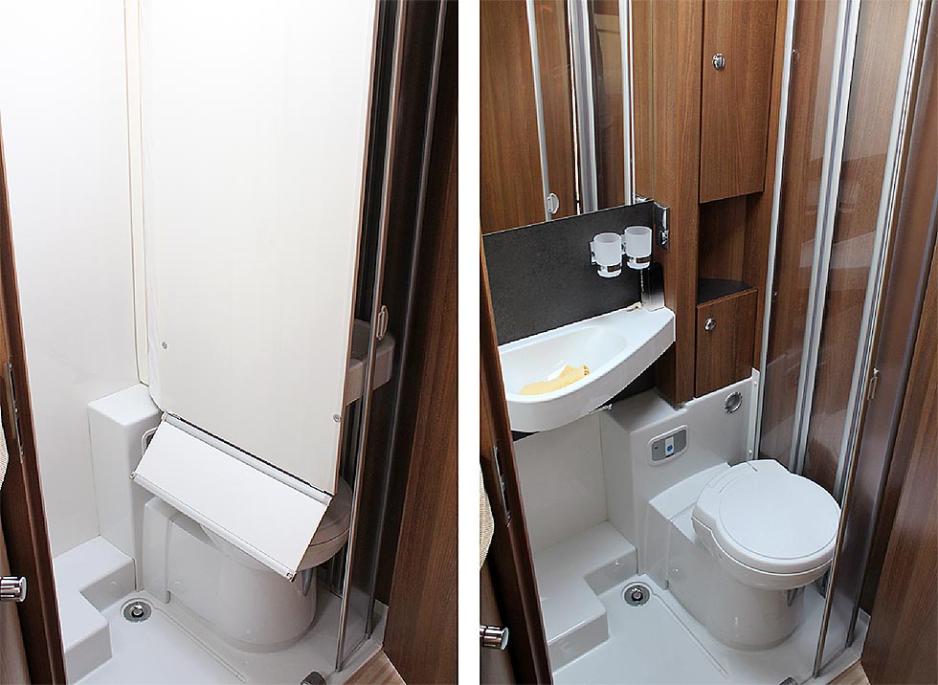 Løsningen på 2019-nyheten Malibu I 441 LE er mulig å få til takket være en helt ny og smart baderomsløsning: Hele veggen med speil og vask svinges til siden og dekker over toalettet når man dusjer. På den måten sparer man plass og får et funksjonelt bad.