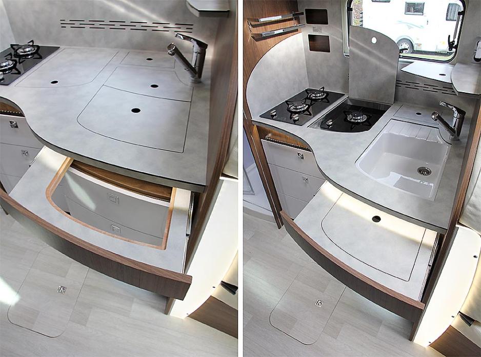 Kjøkkenet er godt over normal størrelse, og er smart løst med sine fire separate lokk. Det betyr at du kan benytte store deler av benken til arbeidsflate når du bare bruker halve vasken (som har to lokk), søppelkassen (et lokk) eller det tredje kokeblusset (et lokk). En smart detalj er at det ene lokket til vasken passer i rammen til den øverste skuffen, og gir avlastningsplass.