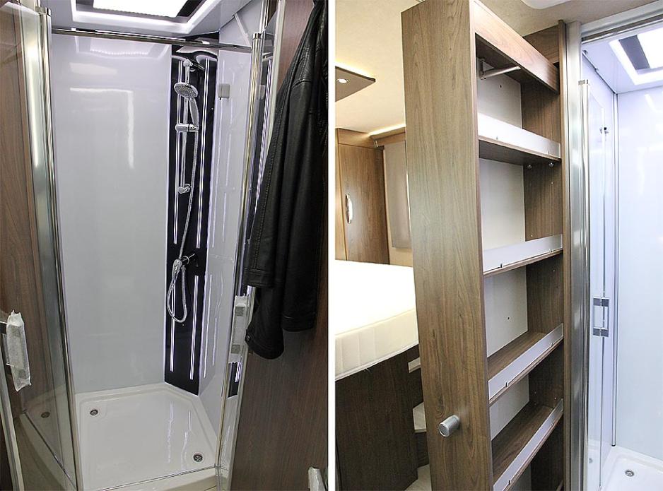 En annen detalj er at du kan bruke døren til toalettet for å stenge av forover i bobilen. I tillegg finnes det en plissédør bak mot soverommet. En god løsning som gir et romslig baderomsareal med lett adkomst til dusj, toalett, vask, speil og håndkletørker.