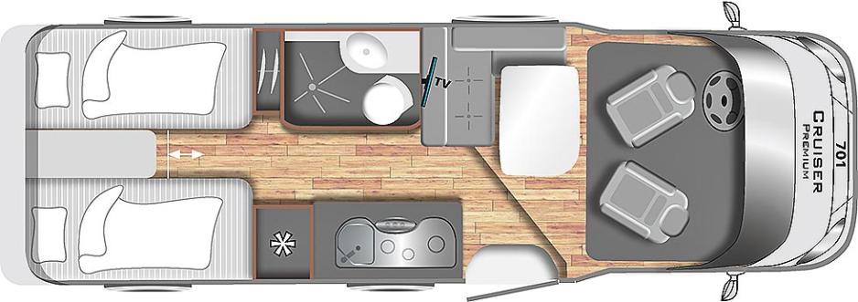 En annen favoritt blant de norske forhandlerne er LMC Explorer I 675, som har samme sengeløsning som ovennevnte. Den integrerte modellen har i prinsippet samme kjøkken- og baderomsløsning, men de to avdelingene har byttet plass.