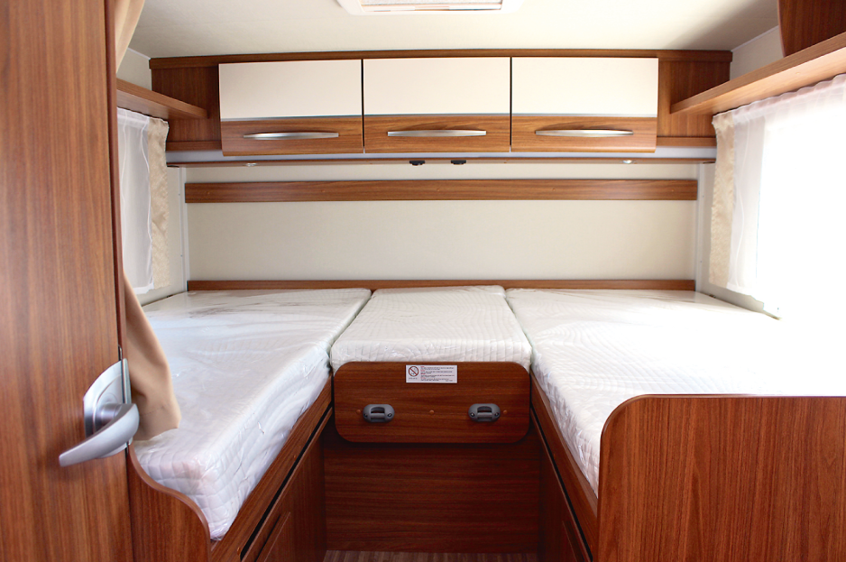 Det er to enkeltsenger bak og som vanlig kan disse bygges sammen i full lengde. Sengene er henholdsvis 210 og 205 cm lange og bredden er 80 cm. Madrassene er 12 cm tykke og ligger på fjærende treribber. Avstanden mellom madrassene er 50 cm og dermed kan sengen bli 210 cm bred. Garasjen under er ganske høy, 120 cm, likevel er takhøyen i sengene 92 cm som fungerer bra. På hver side i rommet er det hyller, i bakkant tre store overskap. Under disse er det en lyslist i full bredde til pynt, pluss to lesespotter. Lufting besørges av takluke og luftevindu på hver side. Framover kan et forheng stenge av, dette når fra taket og ned til madrassen. Rommet er lyst og luftig. Brosjyren forsikrer at madrassene er av høy kvalitet, på oss virket det også slik.