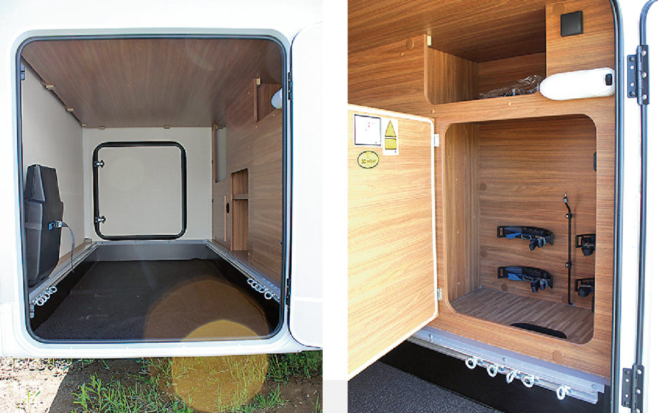 Under fotenden i begge sengene bak er det skap. Hengeskapet på høyre side måler 55x80x105 centimeter. Skjorter og jakker trenger en meter, det har du ikke her. Grunnen er at garderobestangen er plassert unødvendig lavt, 17 centimeter fra taket. Den kunne vært festet 10 cm høyere. På motsatt side er det et skap, nesten like stort. Volumet er imidlertid vanskeligere å utnytte. Et hyllesystem eller liknende ville hjulpet.