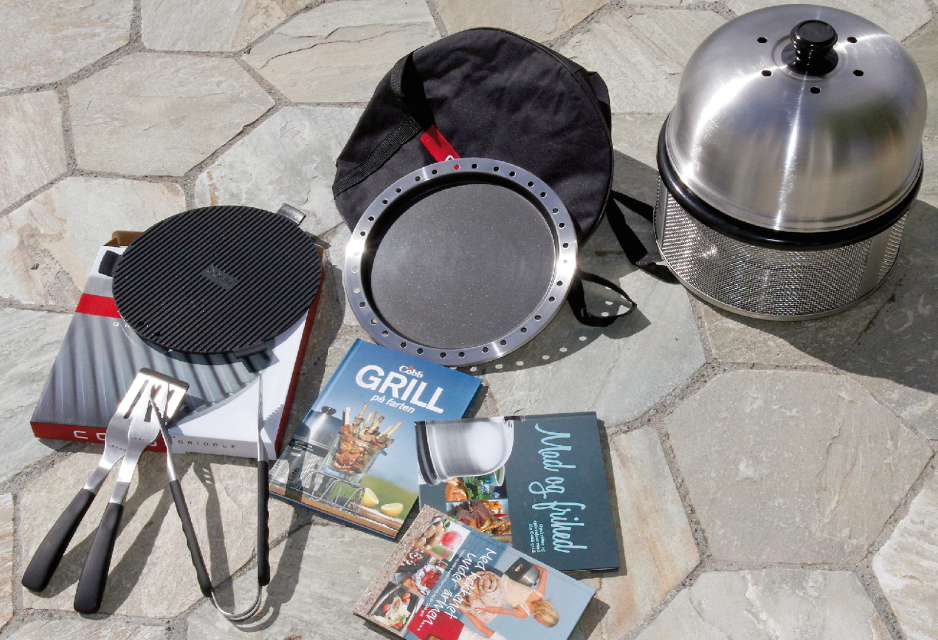 Du kan selvsagt bruke Cobb kun som en tradisjonell grill. Men for å utnytte dens potensiale til fulle er det en fordel å være litt nysgjerrig til sinns. Det finnes store mengder tilbehør: Wokpanne, lokkforhøyer for grilling av hel kylling, pizza-steinbunn, ulike stekeplater og grillrister. Trefjøl med spor til lokket, ypperlig til å holde maten varm og fri for fluer. For ikke å snakke om bakeform, lokkholder, termometer, spesial rengjøringsmiddel og bæreveske.