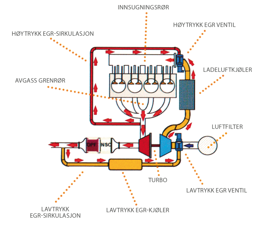 Dermed går avgassene først gjennom den vanlige høytrykksløyfen, så føres avgassene ytterligere en runde gjennom en sløyfe med lavt trykk. Og nettopp fordi trykket er lavt rekker avgassene å kjøles ned i en liten kjøler. Denne komprimerer gassene som gjør at mer av avgassene kan forbrennes ved hver syklus i forbrenningen. Dessuten øker avgassenes kjølende effekt i forbrenningsrommet, noe som ytterligere reduserer NOx. Oppsummert gir dette systemet avgasser som er rene nok til å tilfredsstille kravene i Euro 6 standarden, uten AdBlue.