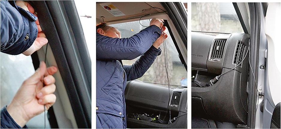 Vi har fått med oss en ekspert til å montere anlegget. Tore Vedvik er key accountmanager i firmaet TT Micro. Tittelen antyder at han håndterer kunder og selgerprodukter, men Tore er også en praktisk mann som blant annet har gjort utalligeinstallasjoner og tester av DAB-utstyr. Tore velger en induksjonsantenne for å få så enkel montering som mulig. Antennen meden pisk plasseres utvendig øverst på frontruten, med en mottaker på innsiden av ruten. Disse kommuniserer trådløst og du slipper dermed å ta hull i bilens karosseri. En klebeantenne er ikke noe godt alternativ på en bobil som denne. Det er på grunn av mye metall som vil stoppe radiosignalene om antennen plasseres på frontruten. Man kan faktisk ende opp med en løsning hvor du får gode forhold når du kjører til et sted, mens du på returen ikke får inn signaler i det hele tatt. Spørsmålet er om pisken er lang nok, eller om antennen i vårt tilfelle må opp på taket forå få optimalt mottak fra sendere på alle kanter av bilen.