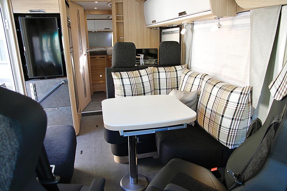 Niesmann + Bischoff Arto 82 E kan leveres med tradisjonelt L-kjøkken og sittegruppe, eller med sidesittere. Sistnevnte heter naturlig nok Face-to-Face. Demomodellen på pressevisningen hadde den tradisjonelle interiørløsningen.
