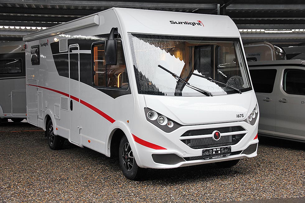 Isny, Tyskland: Ulempen er at du trenger stige for å komme opp i hovedsengen når den er redd opp slik, men for barnefamilier gir dette et hav av plass og tilsvarende mange muligheter. Legg til en romslig senkeseng i front også, og du forstår at denne 6,98 lange bobilen virkelig har fleksible sovemuligheter. Men på grunn av sitteplassene er den kun registrert for fire. I67S er ny av året, og har også en ny halvintegrert søster: T67S. Modellene er kortere versjoner av Sunlights 7,4 meters bestselgere med enkeltsenger.