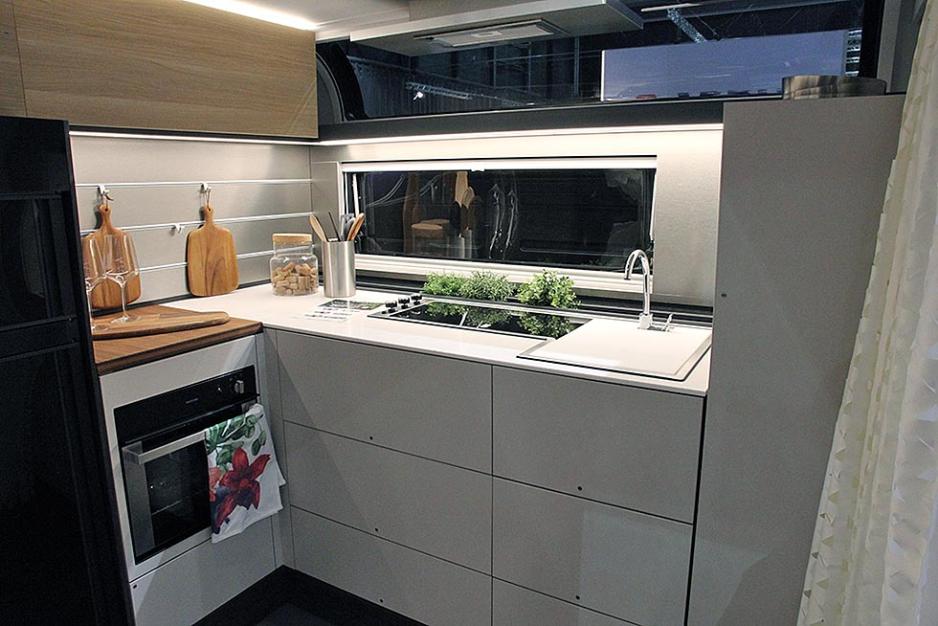 Her er det et moderne interiør med rene og rette linjer, og spesielt god plassutnyttelse. De tre ulike modellene har alle frittstående dobbeltseng. Vår favoritt er 704 HP, som har to doble dører. Det betyr at du kan våkne en deilig sommermorgen og slå opp de to dørene på soverommet, og bare nyte synet og følelsen av landskapet. I andre enden av vogna er det dobbel dør inn til frontkjøkkenet og sittegruppen. Det var denne modellen som var utstilt på Caravanmessen i september. På Caravan Salon viste Adria fram 754DP-modellen.