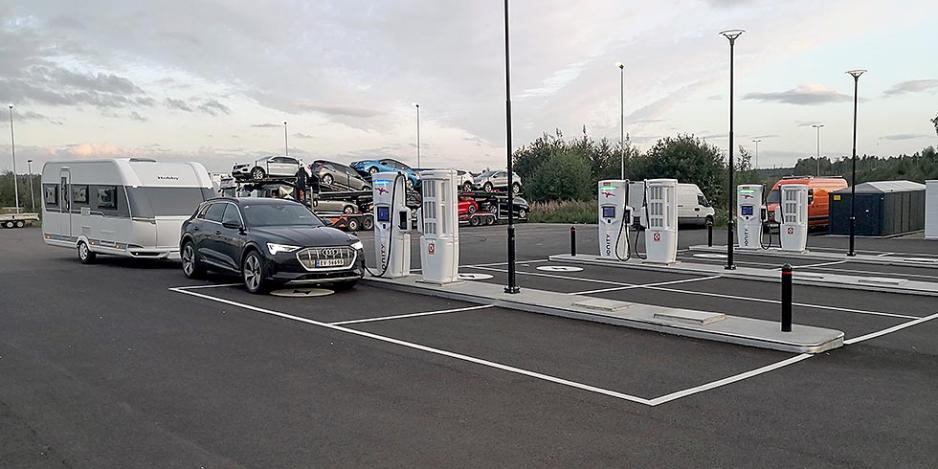 Ennå er det ikke vanlig at elbiler med campingvogner kommer i flokk og følge, men i Vinstra vegpark hadde det vært kjekt med ordentlig raske ladepunkter. Alt som finnes her – utenom Teslas superladestasjon – er 50 kW-ladere i regi av Fortum og Grønn Kontakt. En slik stasjon trenger mer for å håndtere behovet vi hadde i denne testen. Lynladere hadde vært perfekt, og det er opplagt at denne lokasjonen må ha et antall slike på kort sikt. Heldigvis var det lite trafikk på Teslas superladere, slik at vi kunne parkere sideveis med vår Model X og oppta fem ladeplasser. Det anbefales mildt sagt ikke når det «koker» på alle uttak, og det hadde heller ikke vært mulig å snu med vogna om vi ikke hadde hatt området nesten for oss selv. Rygging hadde vært eneste løsning.