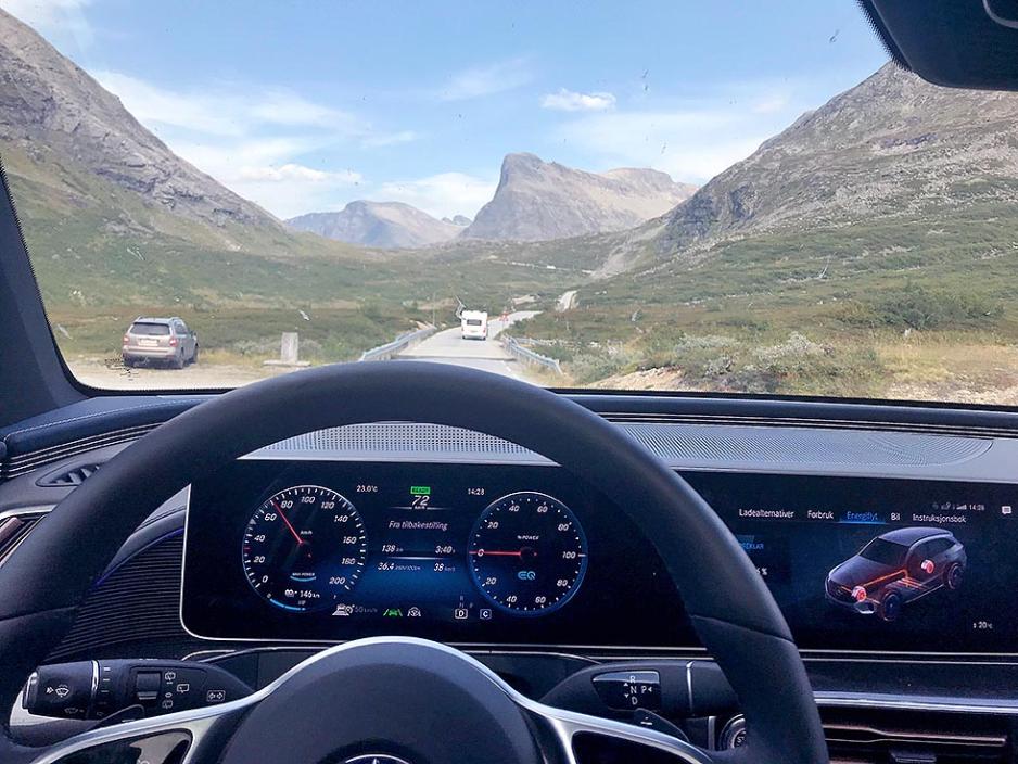 Vi brukte i stor grad adaptiv cruisekontroll på alle tre elbiler under testen, og særlig på de lengre etappene. På trangere veier kjørte vi på tradisjonelt vis, og vi valgte som vanlig bort Eco-innstillinger for bilene (med unntak av Audien, som fikk beholde «Efficiency»-programmet siden det ikke gir egg under pedalen). 17-20 grader i kupeene, avhengig av utetemperatur, og AC tilgjengelig på hele turen. Altså ingen spesiell sparemodus på kjøringen.