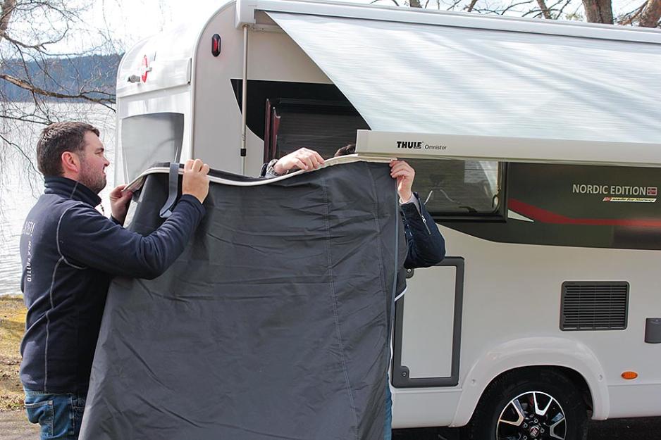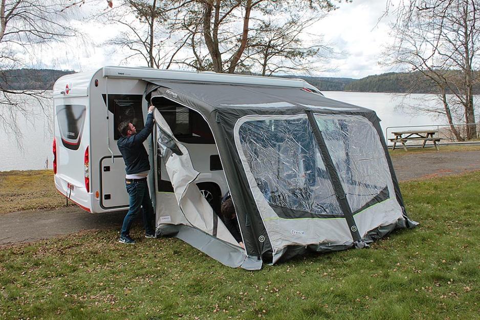Vær klar over at de løse luftstengene bygger ganske mye. På vår testbil, en Bürstner Nordic, så var det litt for liten avstand mellom markisen og døren. Det gjorde at det ikke ble plass til å åpne og lukke døren. Av erfaring vet vi at det er mange ulike plasseringer og løsninger for markisen, derfor anbefaler vi at du monterer forteltet før du kjøper det. Det er også greit å være klar over at som regel går en av sidene på forteltet over et vindu på bilen eller vogna. For det første er det da umulig å få en rett og tett avslutning mot veggen, om du har et utenpåliggende campingvindu.