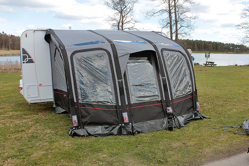 Selve luftstengene er tykkere og har større volum på denne modellen. I tillegg er det hele fire stenger i front. Det gir utslag i flere pumpetak. Likevel tar pumpingen ikke mer enn halvannet minutt. Å tre duken på plass i det noe lengre sporet på vogna tok under tre minutter. Fleksibiliteten til det ferdigmonterte teltet er stor. Det er tre partier i front, hvor du på alle disse kan enten åpne helt, kun ha myggnetting eller dekke til vinduet. Det er dør både i front og på hver side.
