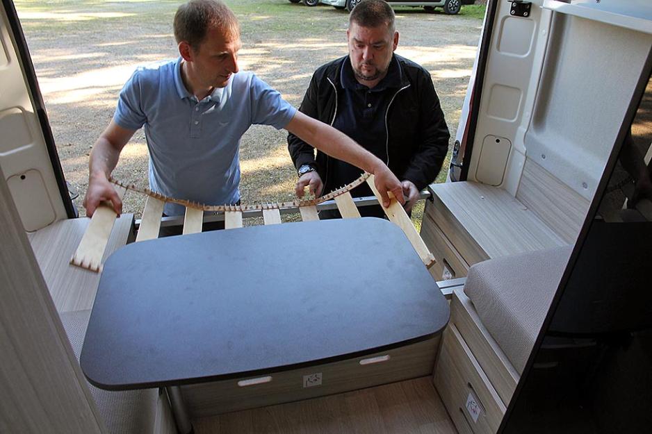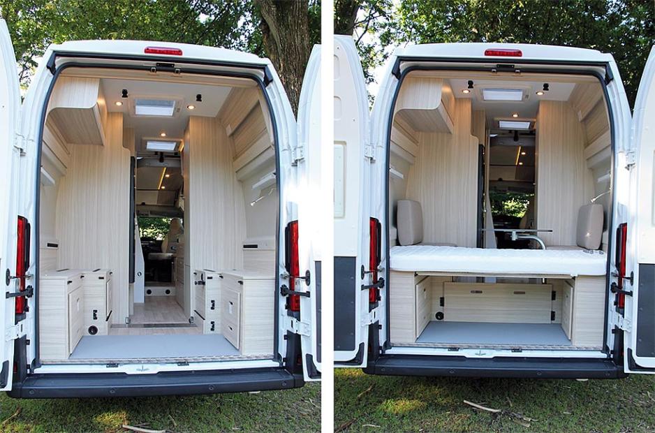Om man ønsker kan man legge ned bordet og få bygget på den nederste køyen til en dobbeltseng. Alle sengeplassene og putene til sitteplassene er enkle å fjerne, og skulle du ha behov for det kan man få en ganske så stor, åpen plass her bak. Det er også mulig å bare fjerne den øverste køyesengen.