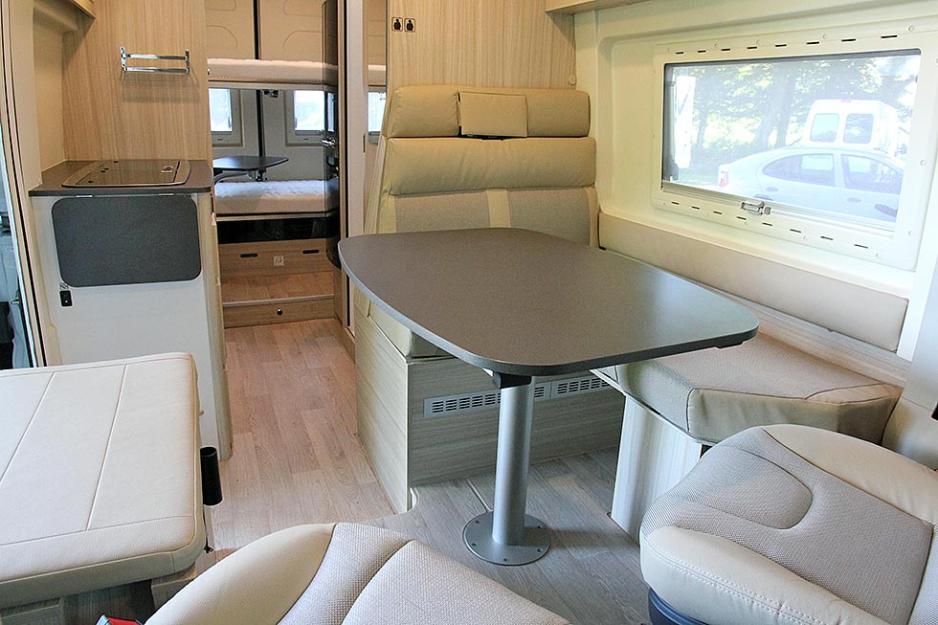 «En barnevennlig salong», kaller produsenten det. På hver side er det en sittebenk med plass til hver sin person, og mellom disse et bord. Helt bakerst finner vi en køyeseng, hvor den nederste soveplassen flukter med sitteplassene og danner en liten u-sofa. Denne kan kanskje tjene som en liten lekeavdeling for barna?