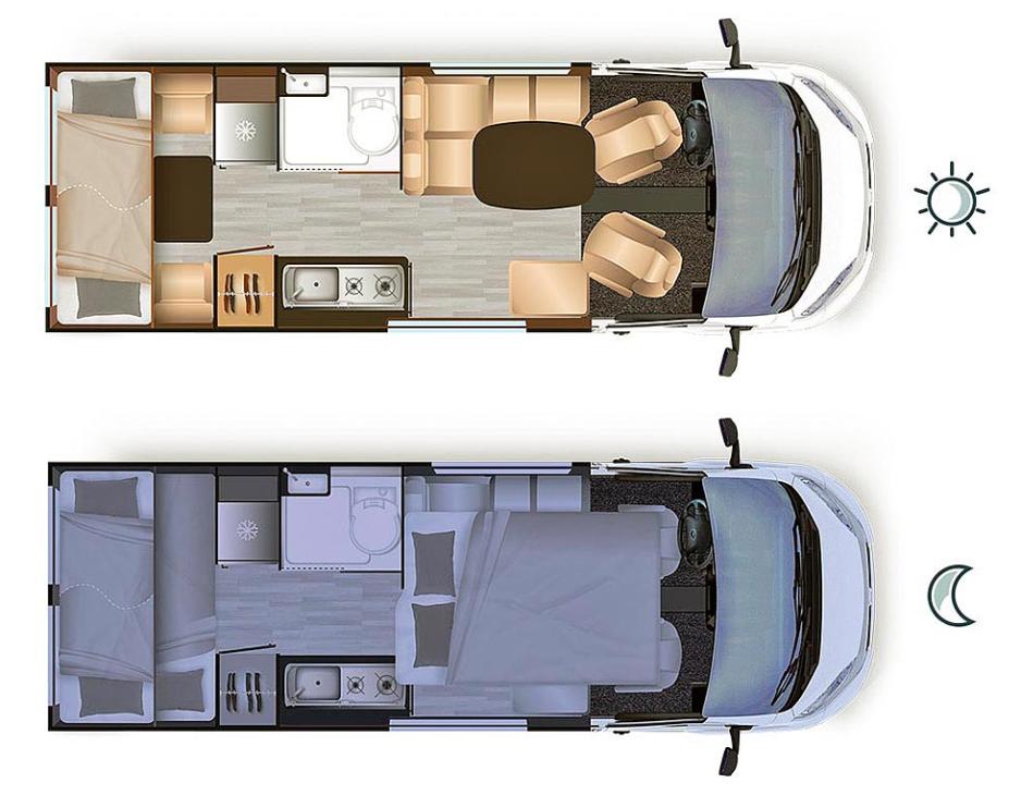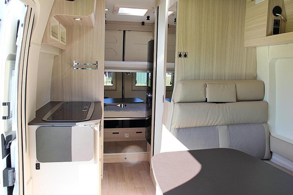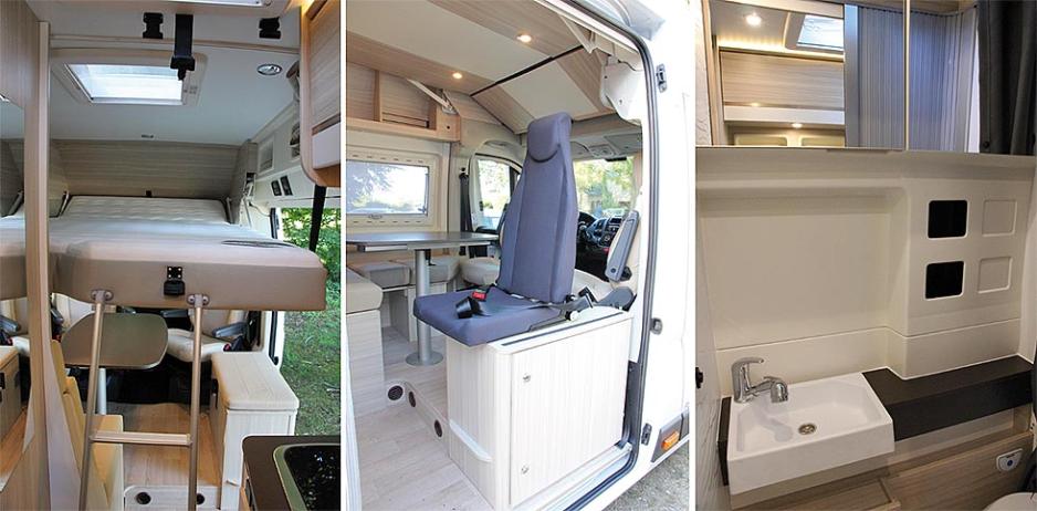Når man åpner skyvedøren ser man i utgangspunktet ikke noe spesielt. En tradisjonell sittegruppe, med bad og kjøkken plassert på klassisk vis. Løfter du blikket vil du se at her er det en langsgående senkeseng med bredde 130 cm. Sidesitteren er litt større enn normalt, og det har sin enkle forklaring: Den rommer nemlig stolen til den femte sitteplassen. Badet og kjøkkenet er parallelt plassert overfor hverandre, og tilsvarende er det høye (!) kjøleskapet og et romslig høyskap.