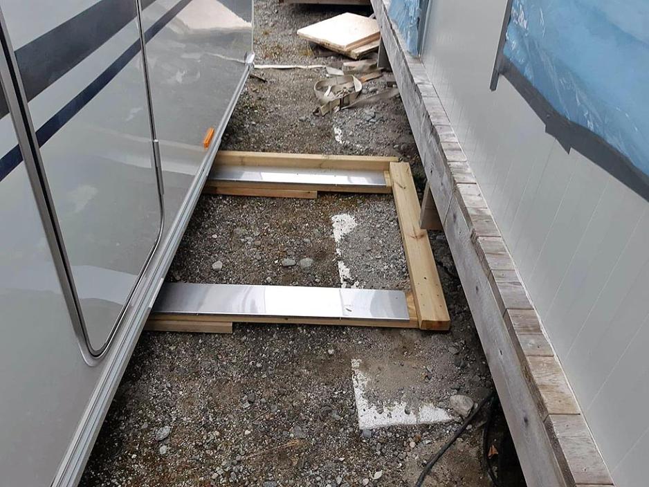 – Midt mellom rullene er en knekt profil montert som har en påsveiset gjengehylse og et M12 gjengestag. Staget trekker vognen mot forteltet. Løsningen gjør at du får satt litt press på pakningen/kontakten inn mot forteltet, så det holder seg tett. Standardmålene er 1000mm x 230mm på rullen, noe som passer til både enkelt- og dobbeltakslede vogner. Produsenten lager også andre dimensjoner på bestilling.