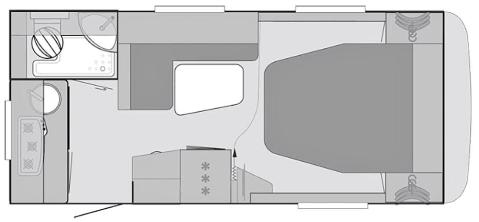 Det er helt unikt det Knaus har gjort på Sport 460 XB, de har plassert en frittstående seng i en kompakt vogn med innvendig mål på kun 4,9 meter. Det er ingen tvil om at resultatet er en campingvogn beregnet for to, selv om det er muligheter for å re opp sittegruppen og få én ekstra soveplass på 157x107. To barn vil kunne få plass her, men dette er en vogn som fort vil føles trang for en familie på fire.
