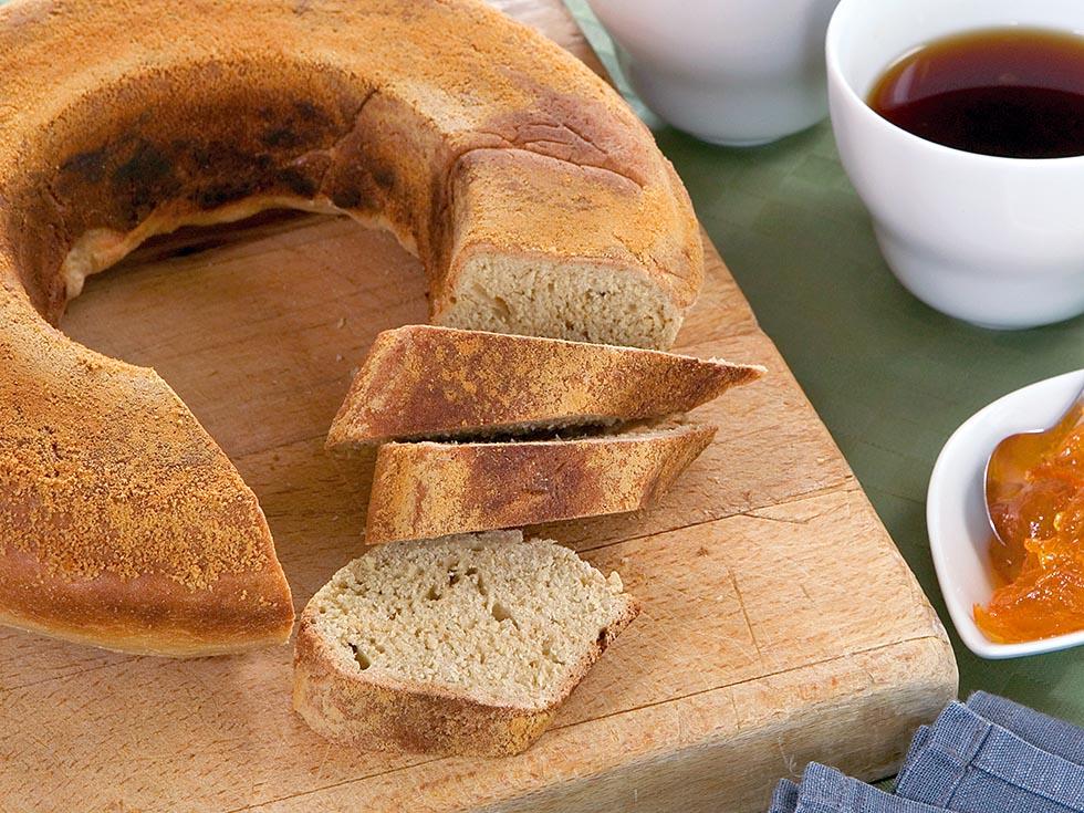 - Olje og strø formen med strøkavring. Ta opp og kna deigen. Form den til en lang rull som rekker hele veien rundt på innsiden av formen. Legg deigrullen i formen og la den heve seg, tildekket, i 30 minutter . Stek på lavest mulig flamme til overflaten er hard og tørr, i ca 30 minutter. Test om det er ferdig ved å banke litt på brødet, det skal høres litt hult.