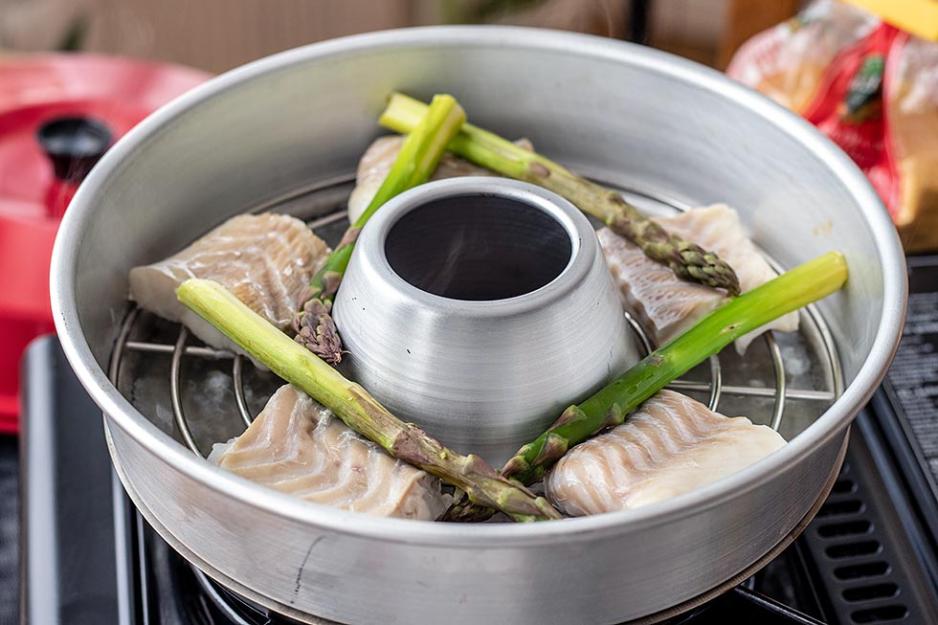 - Skjær fisken i mindre biter og legg den på risten i formen, legg asparges på toppen. Kok i 5-10 minutter. Fisken er klar når den har en indre temperatur på 56 grader.