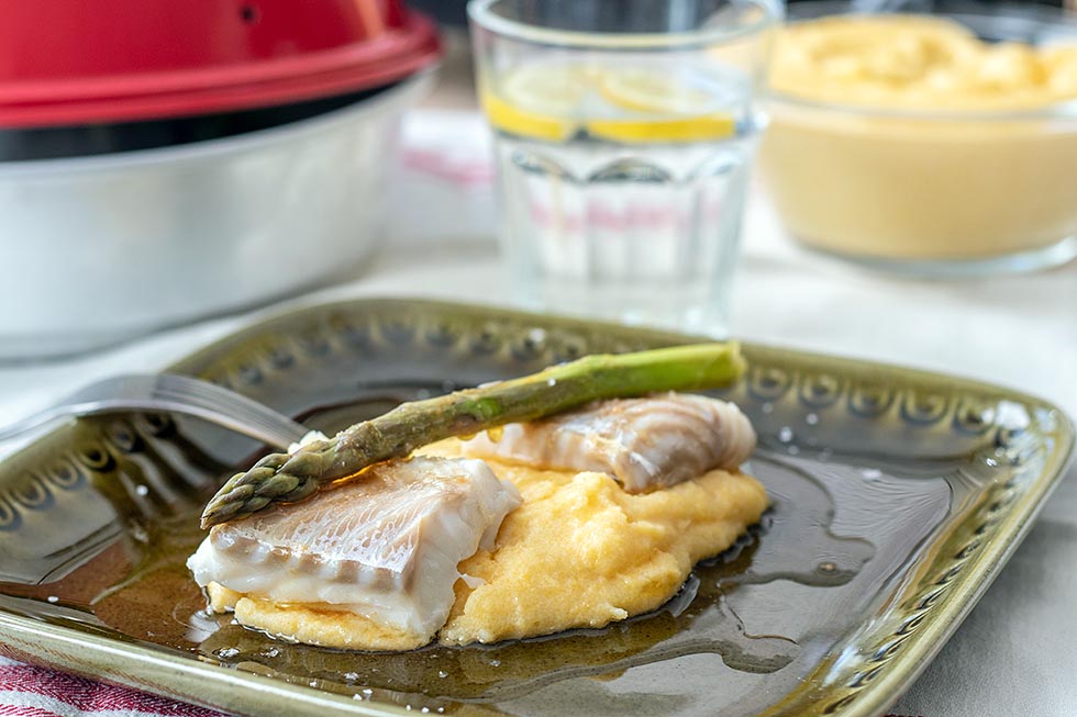 Det finnes nesten ikke grenser for hva du kan lage av mat hvis du har en Omnia. Hva med dampet torsk med polentamos, asparges og brunet smør?
