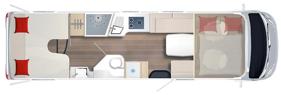 Men la oss først raskt se på den kompakte bybobil-nyheten Eliseo: Serien kommer i fire modeller for 2021-sesongen. To korte på 5,4 meter, en 6,0 meter med tverrstilt dobbeltseng og en modell med lang seng på 6,36 meter. Eliseo kan utstyres med pop-up tak, takvinduer over førersetet og et stort kjøleskap – om man ønsker det.